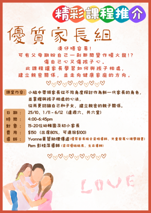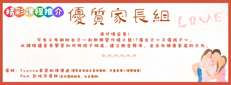 內容:小組中帶領家長從不同角度探討作為新一代家長的角色,並掌握與孩子相處的心法,從而更認識自己和子女,建立親密的親子關係。