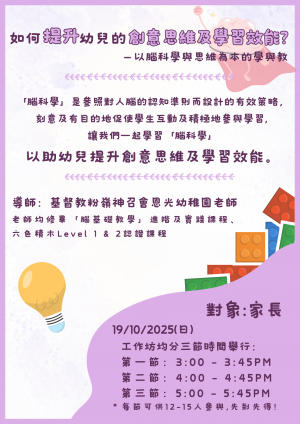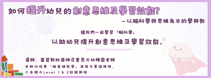「腦科學」是參照對人腦的認知準則而設計的有效策略,刻意及有目的地促使學生互動及積極地參與學習。在工作坊裡,老師會親身示範及介紹「腦科學」的理論及技巧,並以六色積木為媒介,讓家長體驗如何透過「腦科學」的策略,提升幼兒的創意思維及學習效能。