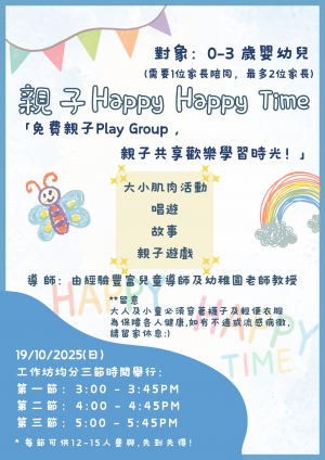 - 此工作坊歡迎新朋友參與,如屬粉神教友請聯絡辦公室2669 8111,謝謝您!- 對象:0-3 歲嬰幼兒 ( 需要1位家長陪同,最多2位家長 )- 留意事項:大人及小童必須穿襪子及輕便衣物。- 為保障各人健康、免交叉感染,如有不適或流感病徵,請留家休息。