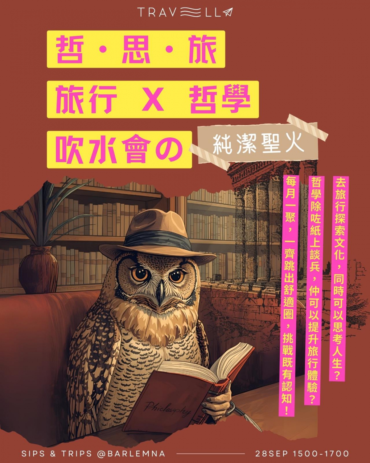 由Travella與哲普推手兼思考狂迷嚴振邦(鹽叔)共同主持,結合輕鬆吹水及知性討論,於每月最後一個星期日,與現場參加者真情對話,從哲學角度審視旅行、觀察社會、思考人生甚至分享靈感。