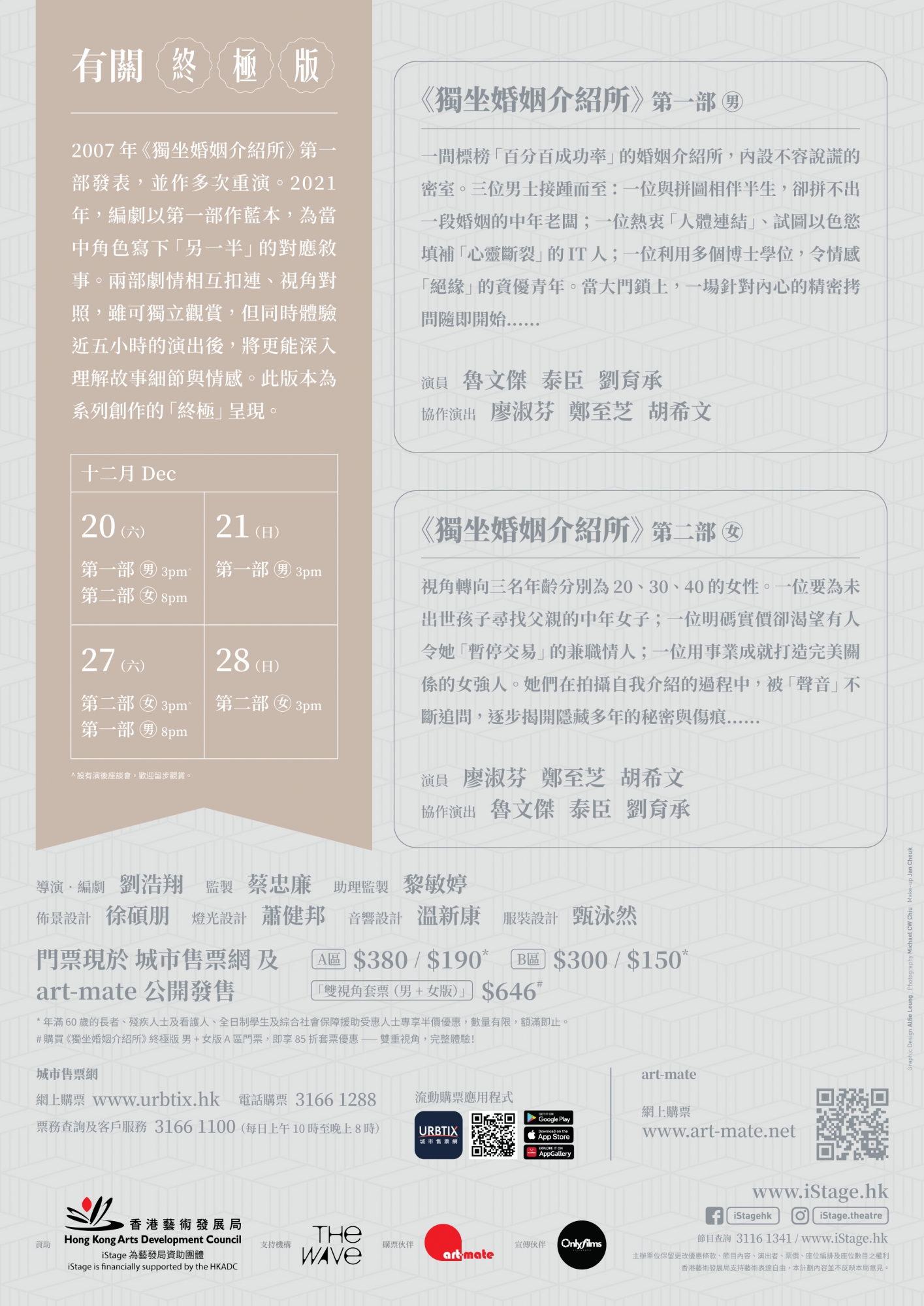 2007年《獨坐婚姻介紹所》第一部發表,並作多次重演。2021年,編劇以第一部作藍本,為當中角色寫下「另一半」的對應敘事。兩部劇情相互扣連、視角對照,雖可獨立觀賞,但同時體驗近五小時的演出後,將更能深入理解故事細節與情感。此版本為系列創作的「終極」呈現。