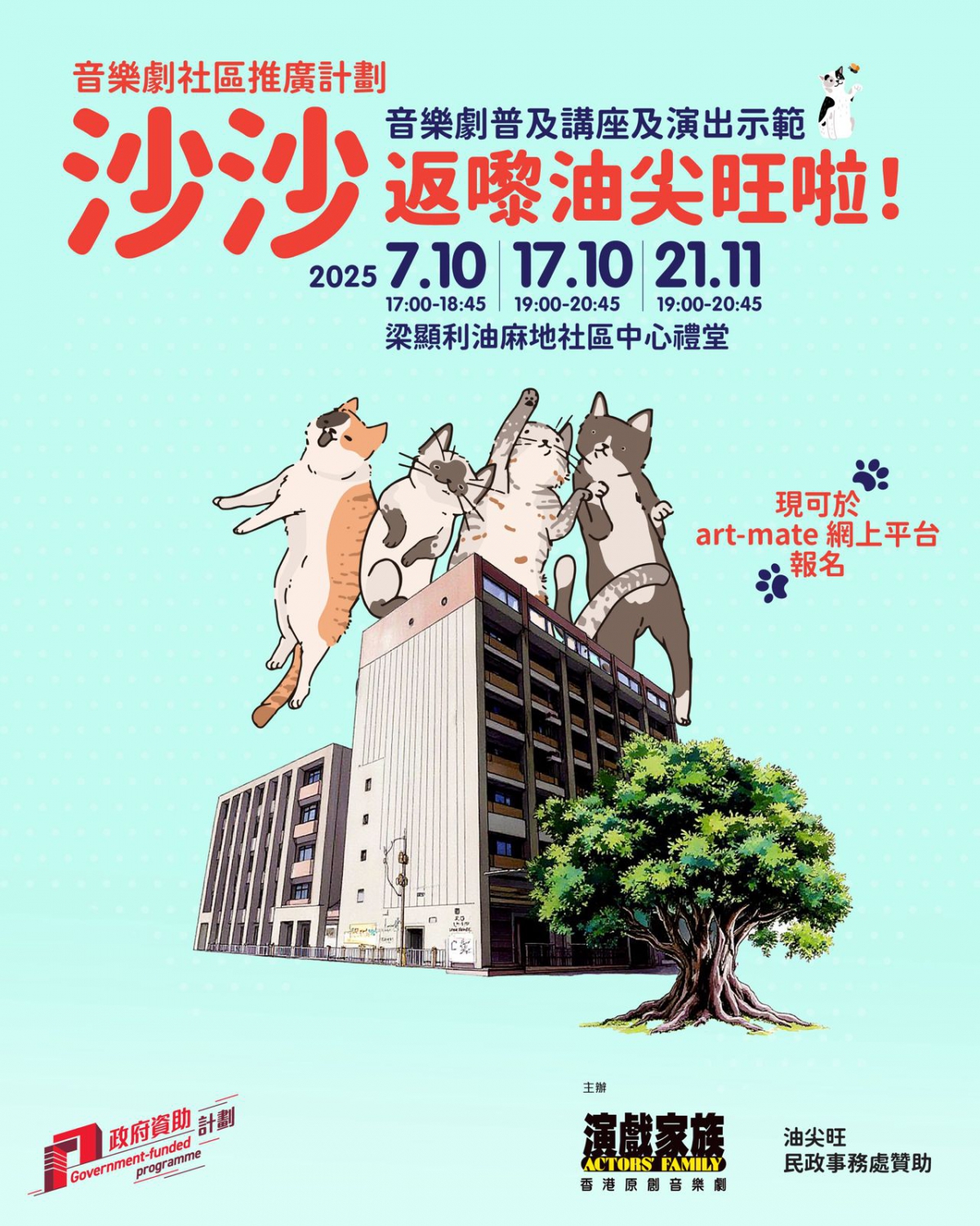 演戲家族喺2021-2024年度「十八有藝——飛越桐油的油尖旺」計劃曾經演出音樂劇《當家貓遇上貓》,講述家貓沙沙同主人失散,喺油尖旺遇上唔同嘅貓,搵路返屋企嘅故事。演出大受歡迎,「油尖旺街角存希望」嘅歌詞更唱遍油尖旺區! 貓貓沙沙同阿角今次終於返嚟屋企同大家再見面喇!