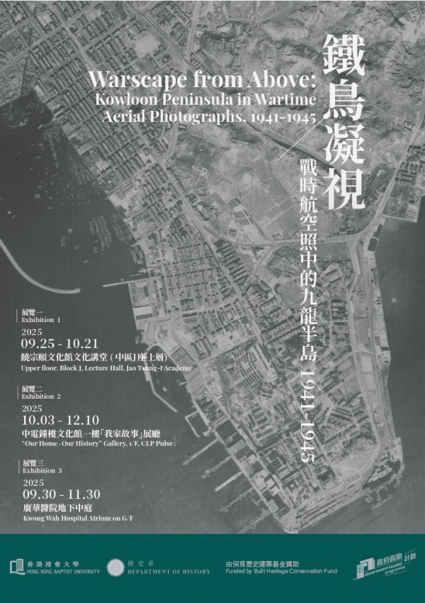 由香港浸會大學歷史系「香港空間史研究計劃」主辦,發展局保育歷史建築基金資助,「鐵鳥凝視:戰時航空照中的九龍半島,1941-1945」展覽及一系列公眾活動將於今年九月至十二月舉行。