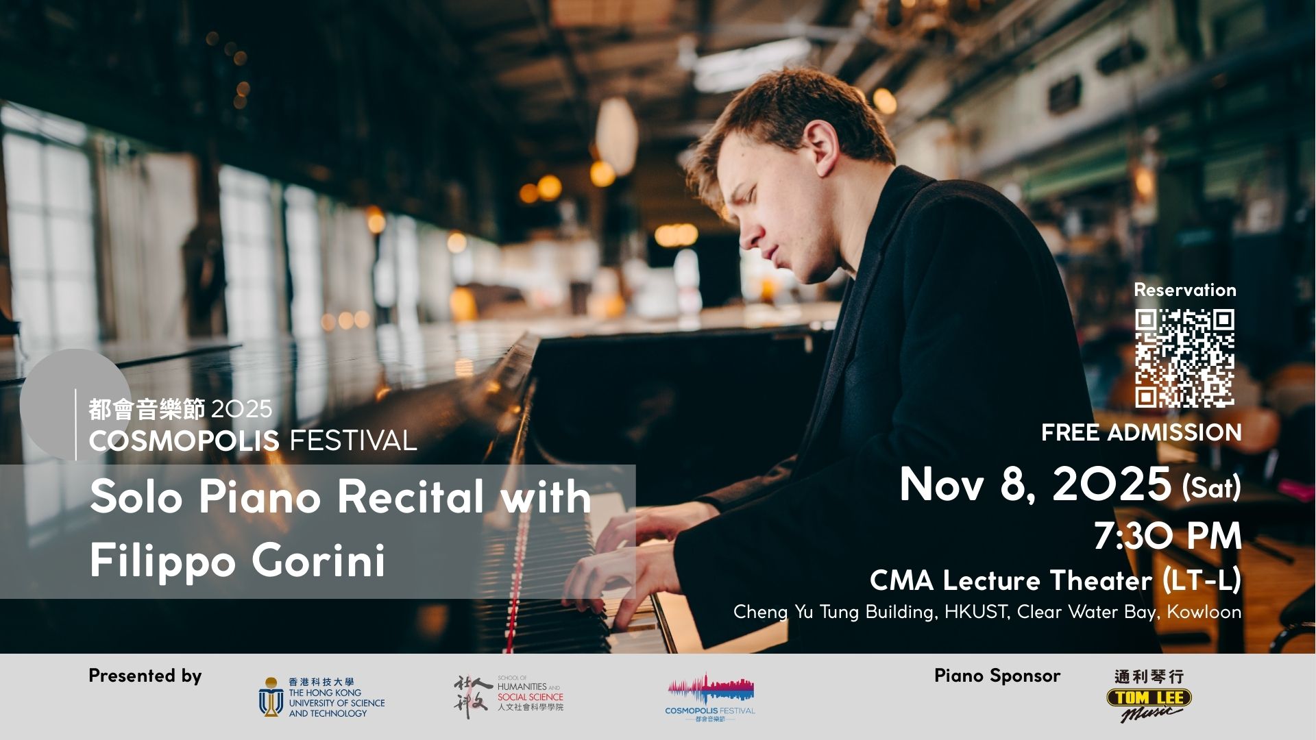 Rising star pianist Filippo Gorini (Italy) brings his innovative project Sonata for Seven Cities, involving month-long residencies in various major metropoles, from Vienna and Cape Town to Hong Kong. In this unique recital, Gorini will perform a new work by his close collaborator, renowned composer Beat Furrer, as well as a world premiere from Hong Kong composer Jing Wang.