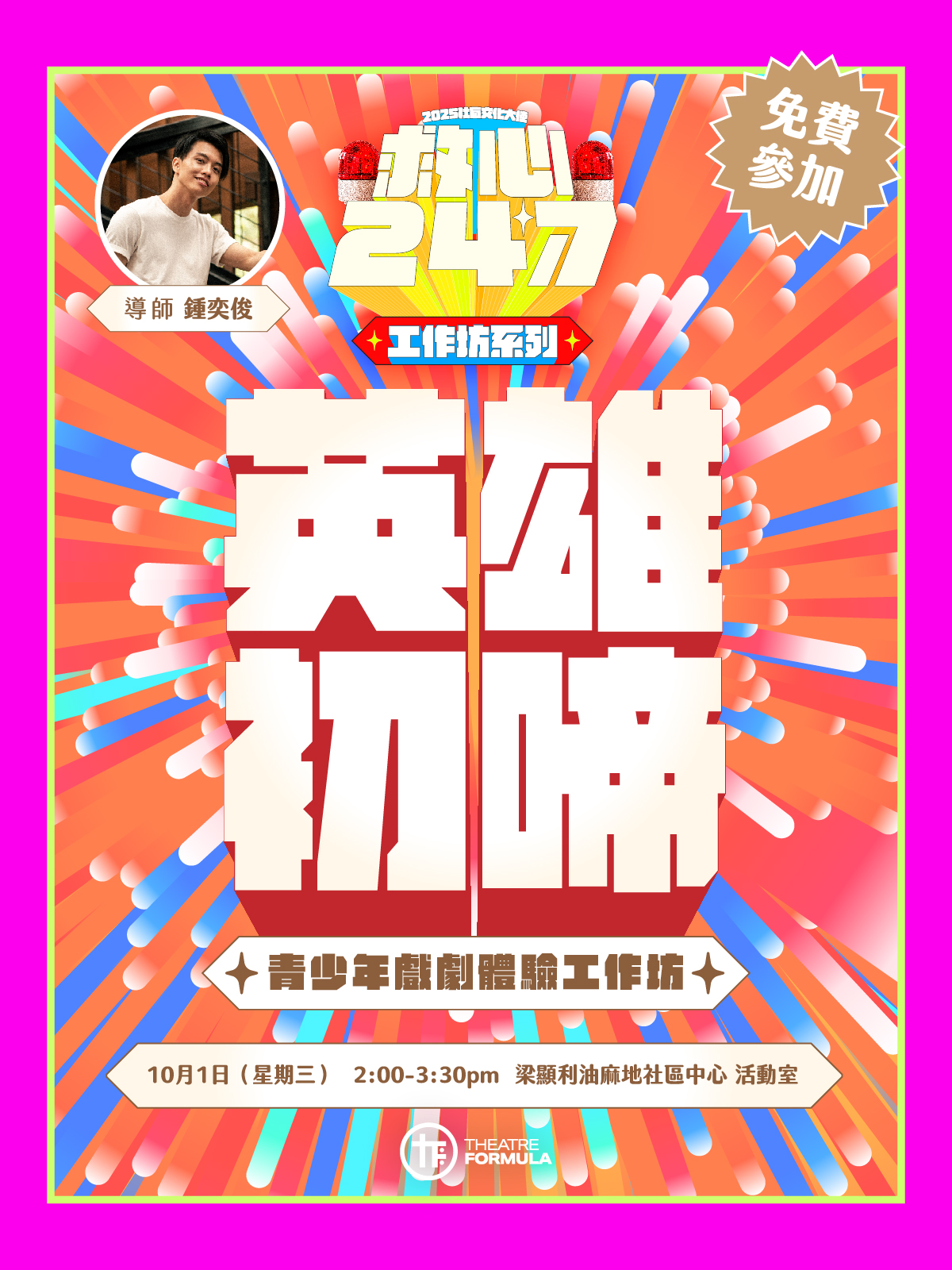 想成為超級英雄嗎? 一方面帶領他們釋放學業壓力,另一方面培養他們的藝文興趣,希望協助學童在應付緊張的功課之餘,也能在身心靈上得到健康的成長。 導師將透過各種練習帶領學童體驗戲劇,更會引用巡迴演出裡的橋段,邀請學童扮演「救心24/7」成員,一起經歷其中借用表達藝術對抗「情緒喪屍」,從而在劇場遊戲之中,教導他們面對壓力與情緒。