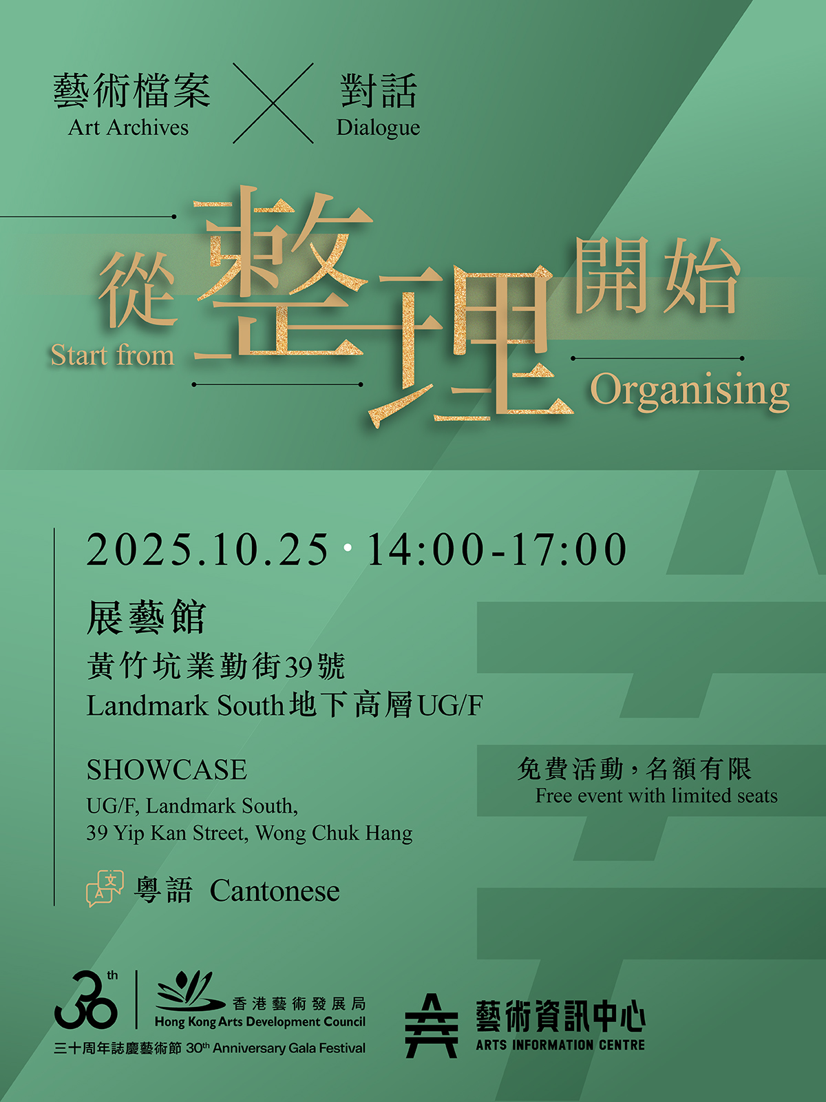 為誌慶2025年香港藝術發展局(藝發局)踏入三十周年,藝發局藝術資訊中心的第二場「藝術檔案 X 對話」講座,將以「從整理開始」為題,邀請多位來自藝術及檔案領域的講者,分享他們在研究、創作和展示方面與檔案保存的多元互動經驗,揭示檔案展示和使用的多元和可能性,開啟大眾對藝術及文化傳承的嶄新想像與參與。詳情如下:
