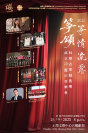 林樱古箏藝術團成立於2005年4月 ,並於2006年正式註冊會非牟利藝術團體,樂團由林樱小姐擔任音樂總監,樂團成立至今次獲邀作公開演出 ,而每年樂團邀請不同本地音樂團體或者音樂家舉辦【筝情流露】音樂會,2025 年適逢古筝成立20週年,我們邀請鼓動鼓樂團参與演出,另外,音樂會由一群初踏舞台筝童和資深成員共同演出,樂曲包括:天涯歌女,步步高,達姆達姆,柳京之舞,醉太平,定風波,將軍令等。