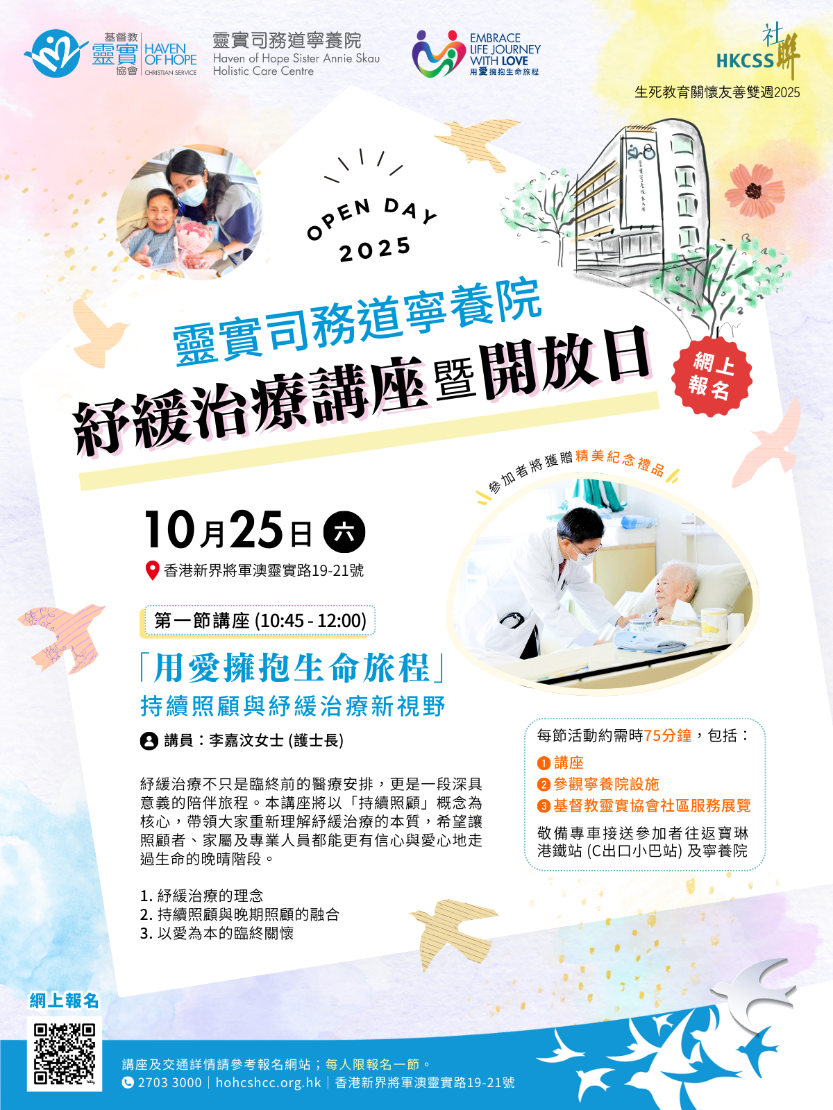 紓緩治療不只是臨終前的醫療安排,更是一段深具意義的陪伴旅程。本講座將以「持續照顧」概念為核心,帶領大家重新理解紓緩治療的本質,希望讓照顧者、家屬及專業人員都能更有信心與愛心地走過生命的晚晴階段。