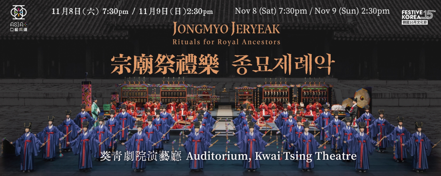 韓國國立國樂院將首次到訪香港,於韓國十月文化節期間呈獻「宗廟祭禮樂」演出。「宗廟祭禮樂」源自朝鮮時代王室祭享儀式,重現祭官們當時身著的正式祭禮服飾、演奏、歌唱和舞蹈。這項擁有500年歷史的儀式是韓國珍貴的文化遺產,並於2001年被聯合國教科文組織列入人類非物質文化遺產代表作名錄。