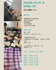 於這次的工作坊中,導師將為各位講解染布的精鍊和媒染程序,以及植物染料的處理方法。參加者將親手紮染與設計,體驗布料蒸煮過程,並於完成後學習布料的照料及處理。