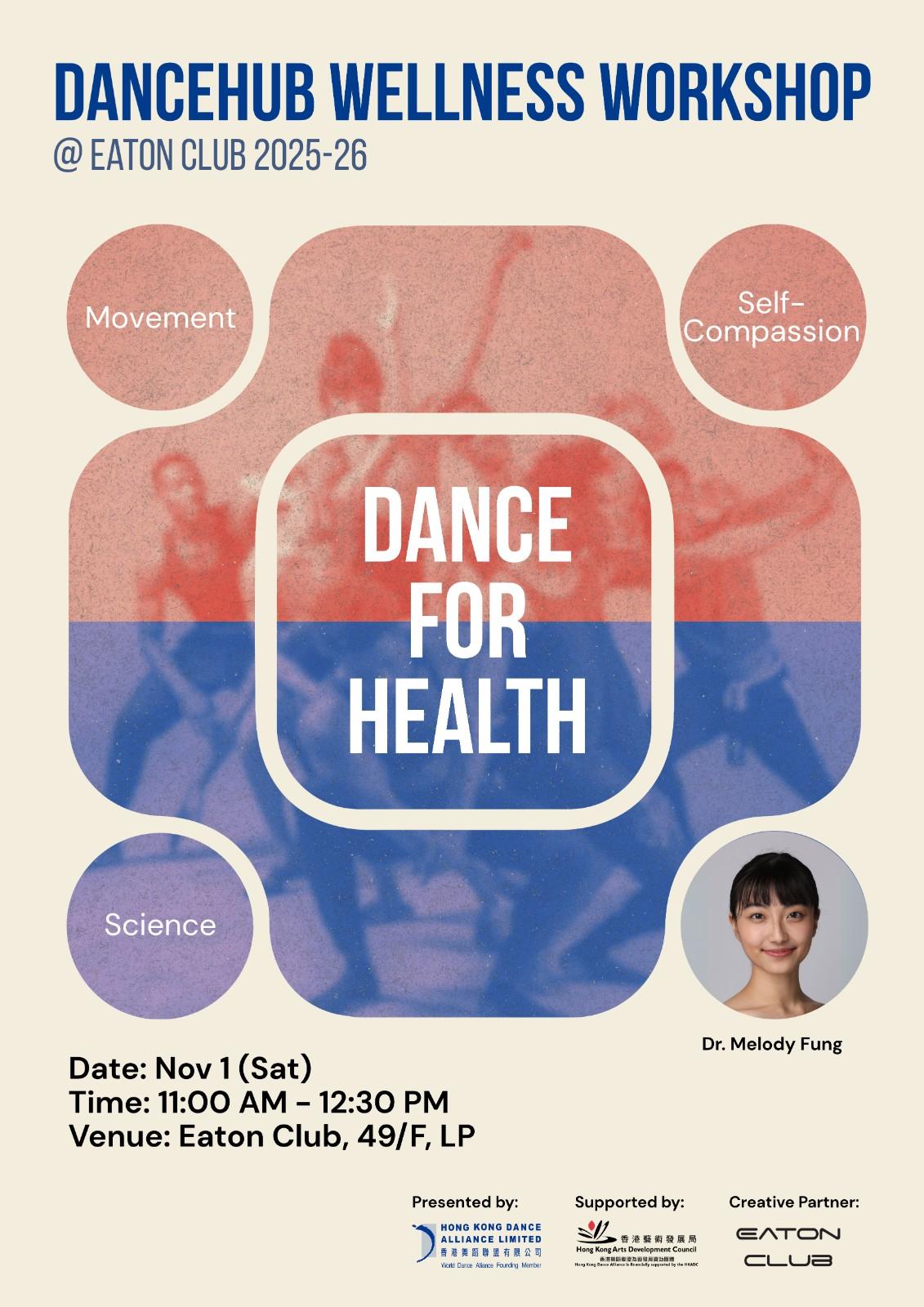 香港舞蹈聯盟致力於推動舞蹈界發展,並探索舞蹈對社會不同群體的幫助。我們與創意夥伴 Eaton Club 即將合作推出六期《舞動健康》系列,展示舞蹈在維繫身心健康的功用。在朗豪坊的工作坊中, 這個系列將結合科學、運動和舞蹈實踐,促進跨學科對話。