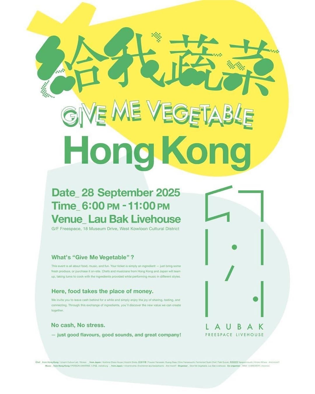 什麼是「給我蔬菜」?這是一場結合食物、音樂與樂趣的混合體驗活動。你的門票就是食材——帶來新鮮食材,或在現場購買即可入場。來自香港和日本的廚師與音樂人將攜手合作,一同以帶來的食材進行創作,並交替演奏不同風格的音樂。在這裡,食材取代了金錢。我們邀請你暫時忘卻金錢,單純享受分享與交流的快樂。透過彼此交換食材,你將體驗到嶄新的價值,並一同創造無限可能。無需金錢、無需壓力——只有美味的料理、動聽的音樂、愉快的氛圍與美好的相遇!