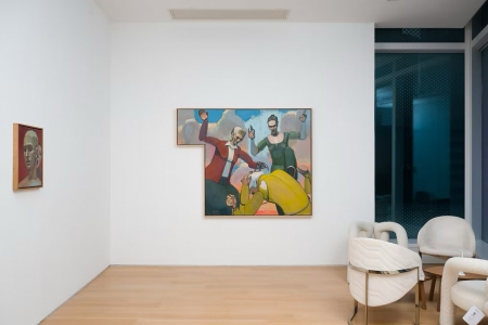 這種探索延伸到了「新年快樂」系列,也是本次展覽三件大尺幅作品。貝克特(Samuel Beckett)的劇本《哦,美好的日子》(Oh les beaux jours)對張慧有很大影響,劇中人物透過回憶串聯起一生中的片段,採用意識流的方式,互相否定、打亂時間,創造出一種更廣闊的敘事空間。張慧借鑒這種方法創作了三件大尺幅作品,從某一年中選擇某個節點,就像「那一天」一樣,來代表一整年的經驗。在畫面結構上,張慧刻意加入「賀卡」的意味。賀卡象徵著節慶和儀式,人們因此放棄了對真實性的執著,而轉向象徵性的理解,賀卡的平面性也讓藝術家更自由地編織畫面。
