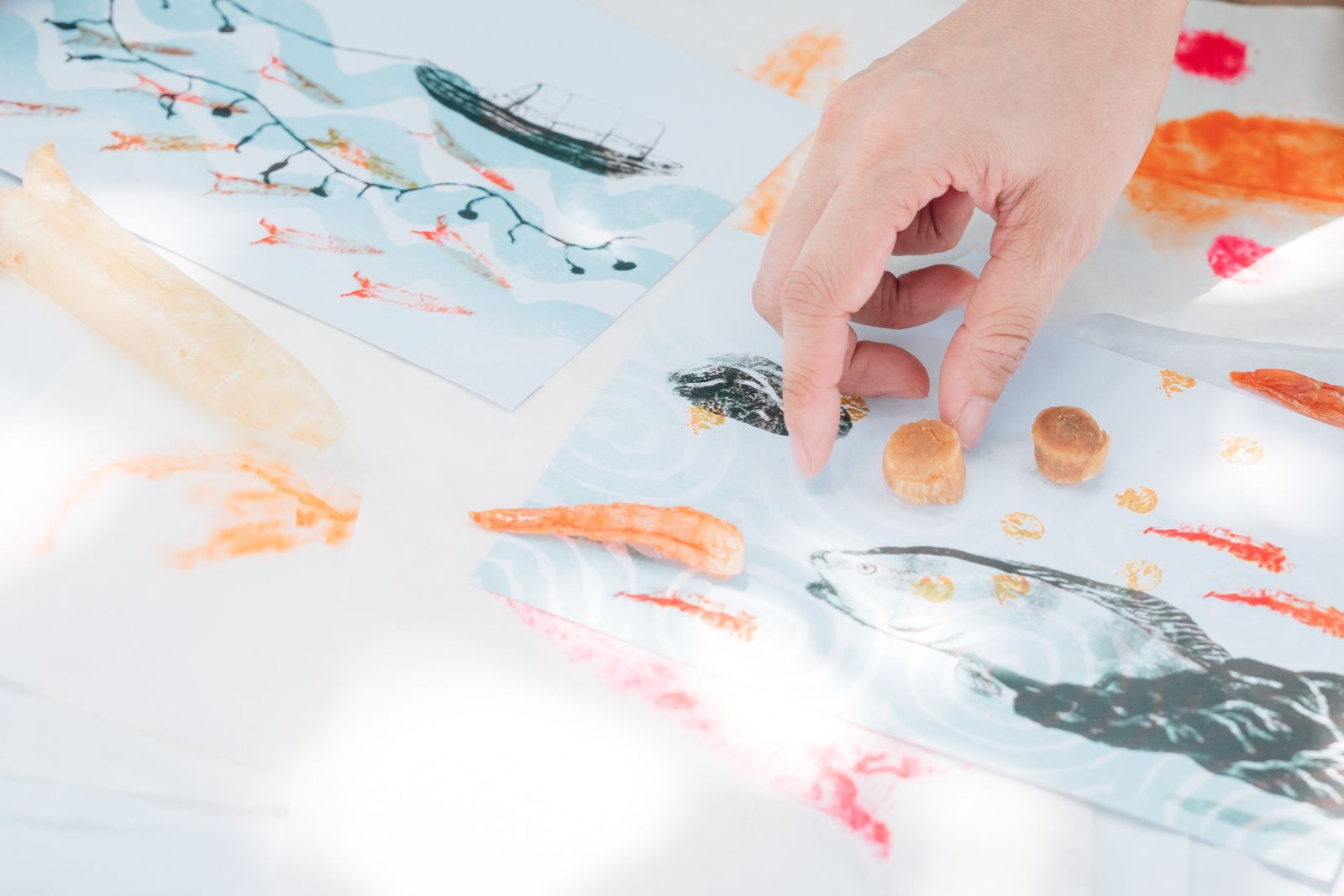 活動以水上人生活文化為靈感,參加者將以香港仔的海味乾貨進行拓印,一邊親手把花膠、魷魚、蝦乾的紋理印在明信片上,一邊了解海味背後的文化與故事。透過拓印,參加者可以刻劃南區的色彩與珍味,將「漁樂無窮」帶回家,為南區漁港文化留下印記。