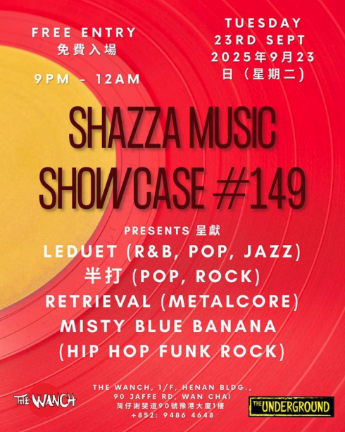 嚟Shazza Music Showcase #149發掘香港新一代音樂新勢力啦!記低日子,10月15日(星期二),去The Wanch感受最raw最真嘅現場音樂,四隊本地新band會輪流上台爆發。無論你係鍾意搵新聲音、追live感覺,定係想知香港而家玩緊咩音樂,呢個夜晚你一定唔好錯過。免費入場,快啲約埋朋友一齊嚟,率先見證香港現場音樂舞台嘅未來!
