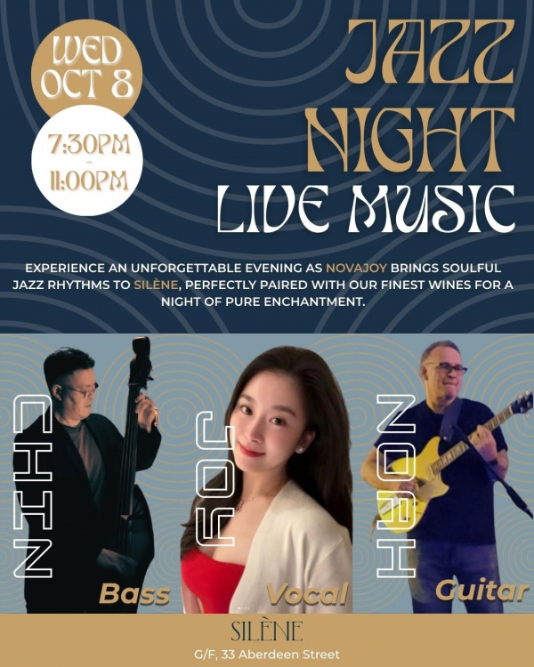 On Wednesday, October 8, the stage at Silène comes alive with the soulful sounds of NovaJoy, featuring Joy Tsai on vocals, Chin Tan on bass, and Noah Herschman on guitar. Together, they'll bring you an unforgettable evening of smooth jazz rhythms, perfectly paired with Silène's finest wines and curated bites.