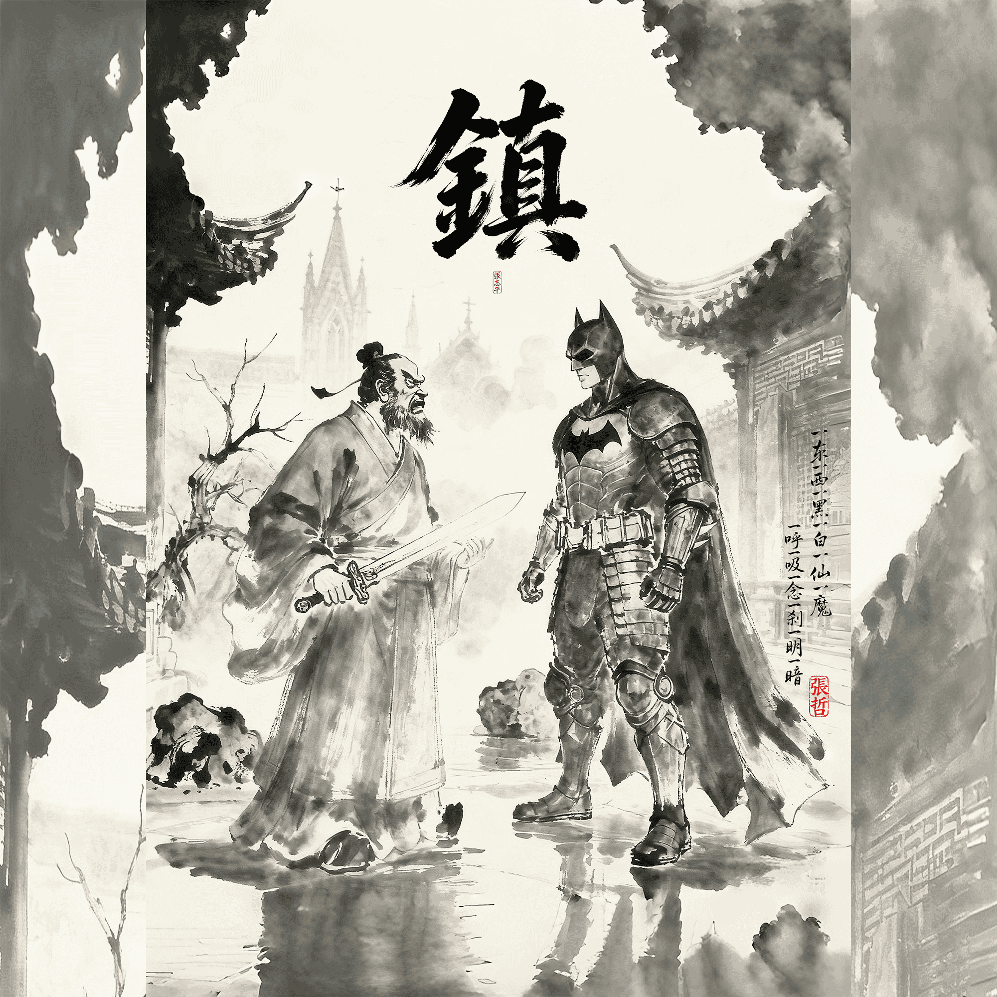 「當雕塑遇上3D打印」的創作過程中,藝術家張哲經歷了七個多月的不眠不休,面對零認識的挑戰、挫敗的考驗,以及對未知的依賴與突破,最終形成了本次展覽的主題「鎮」。對他而言,「鎮」承載著多重意義,展覽的主軸由鐘馗與蝙蝠俠兩個角色主導,兩者共同肩負著「鎮煞百鬼」的使命,守護著家園。他們都是在光明與黑暗之間遊走的執法者,以悖論的方式成為對抗邪惡的英雄。