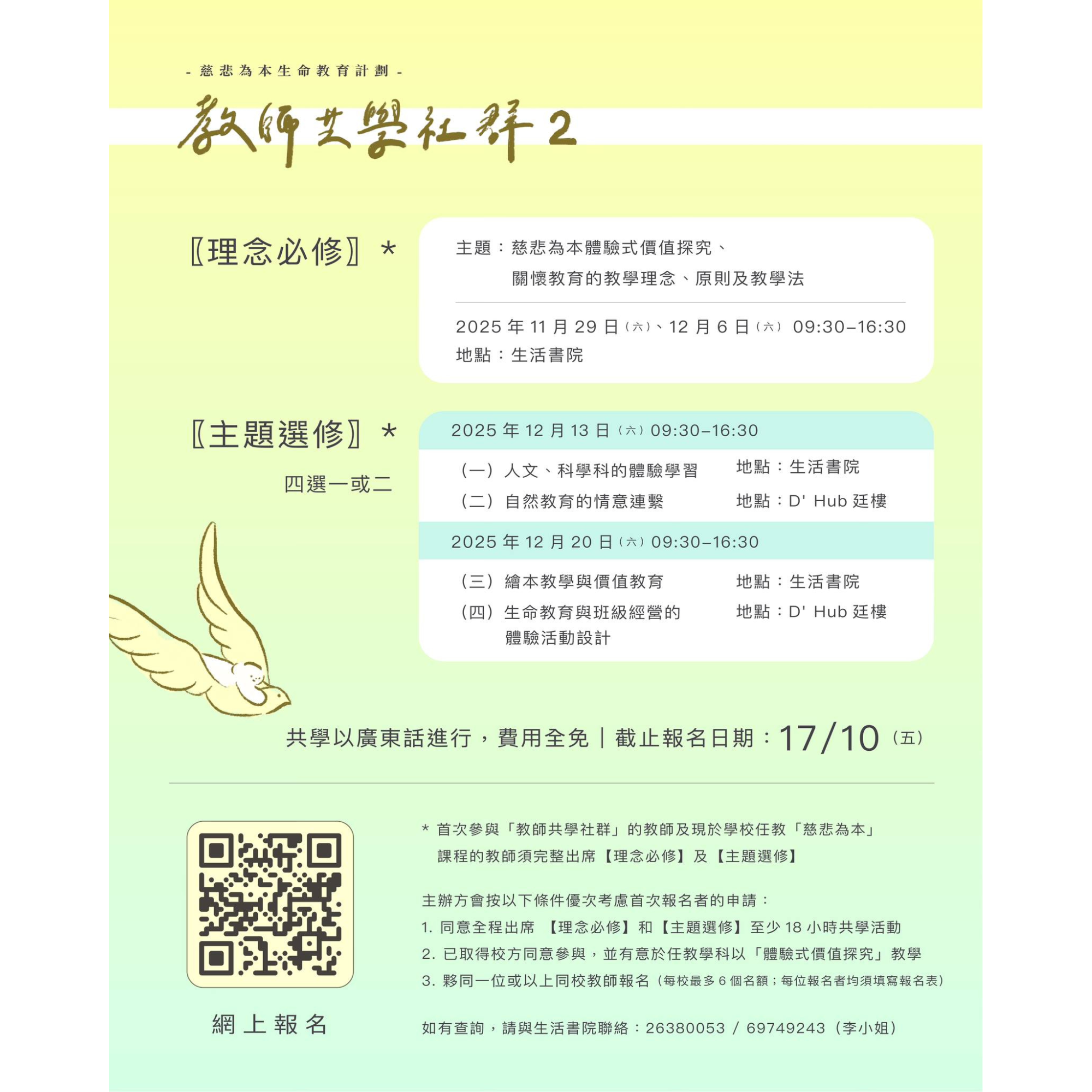 「慈悲為本生命教育計劃」由陳廷驊基金會創導、生活書院策劃,自2020年開始陸續與本地十二間小學協作,聯同不同專業領域的體驗學習夥伴,期望能培育孩子成為實踐慈悲的主體。我們期望將六年累積的寶貴經驗和學界交流分享,促進跨校的交流及協作,為思索和回應未來社會和教育需要提供具實證經驗的參考,現誠邀各位對生命教育有熱誠、期望將體驗式價值探究帶到教學的老師參與共學!