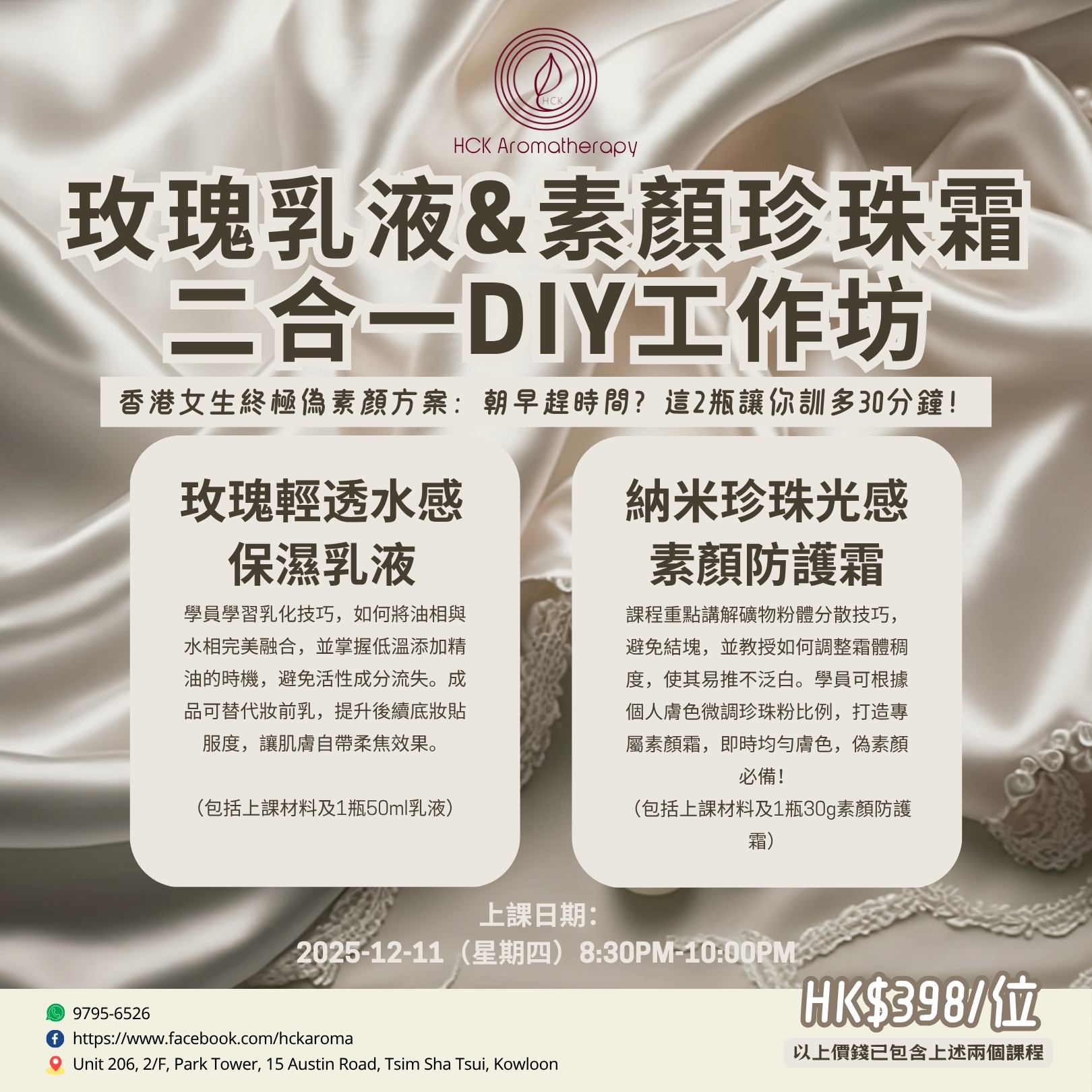 大馬士革玫瑰精油以其修復功效聞名,配合荷荷芭油鎖水,質地輕盈易吸收,特別適合香港潮濕天氣。學員學習乳化技巧,如何將油相與水相完美融合,並掌握低溫添加精油的時機,避免活性成分流失。成品可替代妝前乳,提升後續底妝貼服度,讓肌膚自帶柔焦效果。(包括上課材料及1瓶50ml乳液)