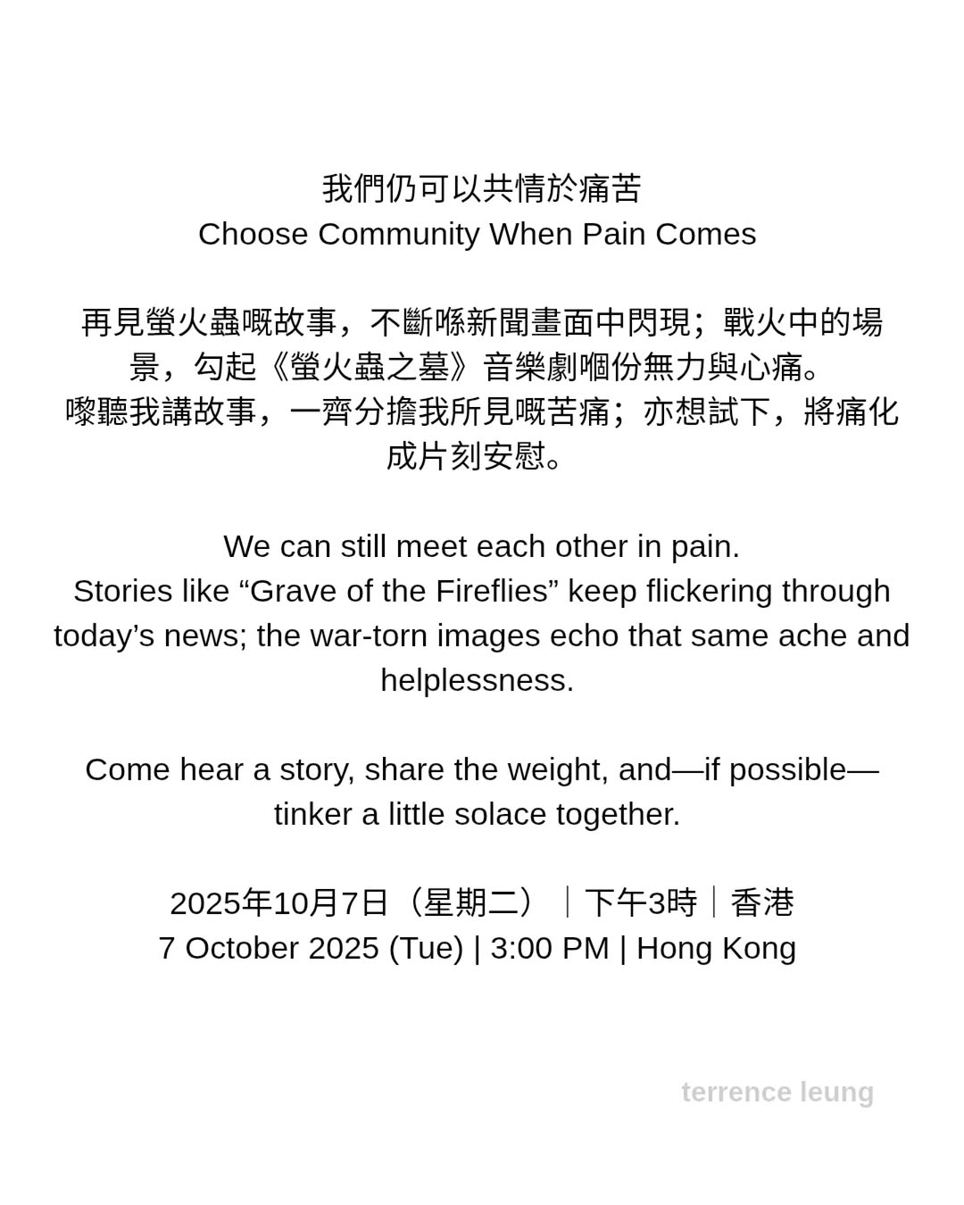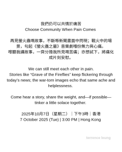 No one has to be alone. 人道實驗劇場:再見螢火蟲之最後一刻「哥哥,你會唔會攞到嘢食返嚟?我好餓。有冇肉呀?」以《再見螢火蟲》原創廣東話音樂劇為藍本,演員為今時今日受盡戰爭之苦的兒童發聲,利用音樂和故事建構同理世界。從旁觀他人之痛苦到自我覺察,期望故事能在觀眾心中種下善良種籽。