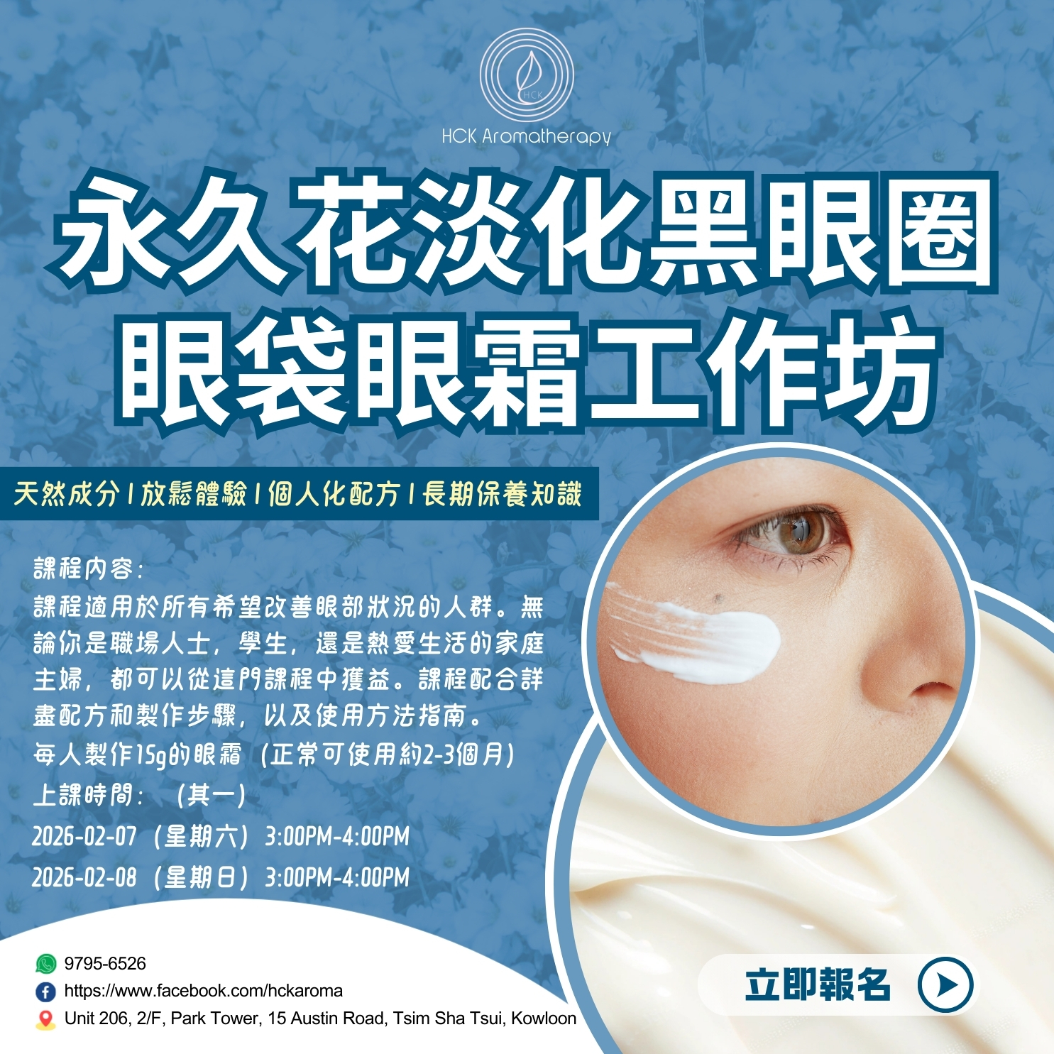 告別熬夜熊貓眼!親手調製天然植物精油眼霜,精選永久花等珍稀成分,有效改善黑眼圈與眼袋問題。課程將傳授專業配方與製作技巧,讓疲憊雙眼重現明亮光采。無需經驗,適合所有追求天然護膚的愛美人士。課堂每人製作15g的眼霜(正常可使用約2-3個月)