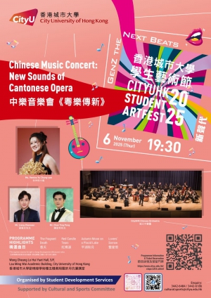 粵曲常被視為過時,但年輕一代正為其注入全新活力。城大中樂團攜手城大獸醫學士學生兼粵劇演員余仲欣小姐,為您呈現新生代對傳統技藝的獨特詮釋!精湛的中樂演奏結合細膩的唱腔,城大學生藝術節壓軸演出將展現粵曲藝術的精髓與當代風采,帶領觀眾走進粵曲的世界,淺嘗本土粵樂的傳統文化。