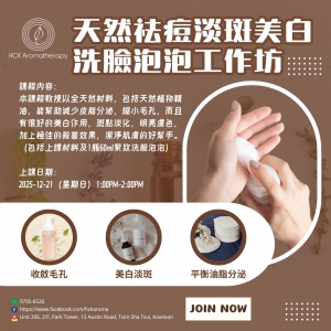 本課程教授以全天然材料,包括天然植物精油,能幫助減少皮脂分泌,縮小毛孔,而且有很好的美白作用,斑點淡化,明亮膚色,加上極佳的殺菌效果,可說是潔淨肌膚的好幫手。(包括上課材料及1瓶60ml洗臉泡泡)
