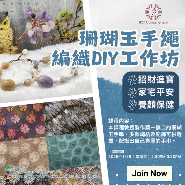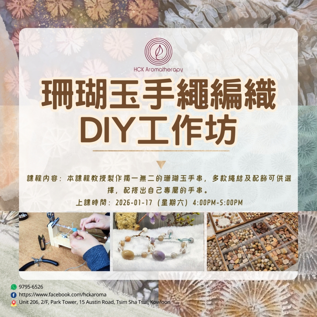 本課程教授製作獨一無二的珊瑚玉手串,多款繩結及配飾可供選擇,配搭出自己專屬的手串。