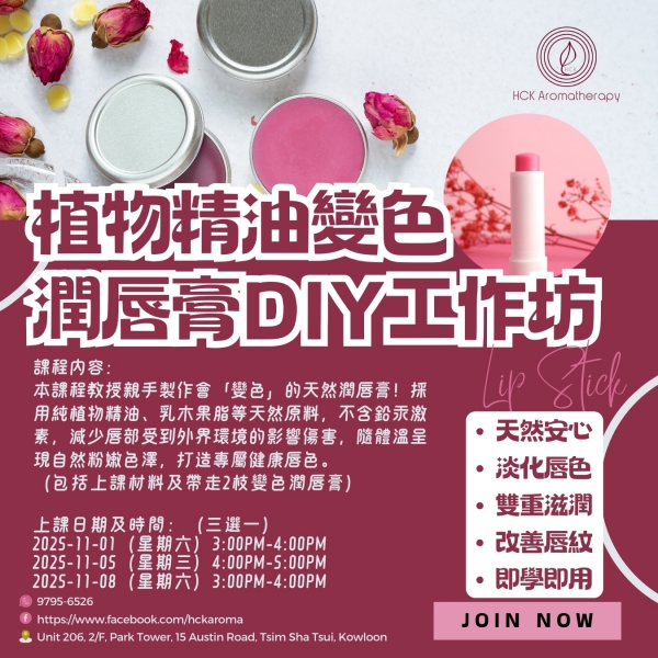 本課程教授通過純天然配方,自然粉嫩,不含鉛汞色素。唇部回復如櫻花般的粉紅色澤,輕輕一塗,就算用餐後也可持久天然潤紅、天然健康,且不沾杯,不掉色,還可用在其他需要潤紅的部位。成品是無色的,塗抹到唇部後,慢慢呈現紅色。(包括上課材料及帶走2枝變色潤唇膏)