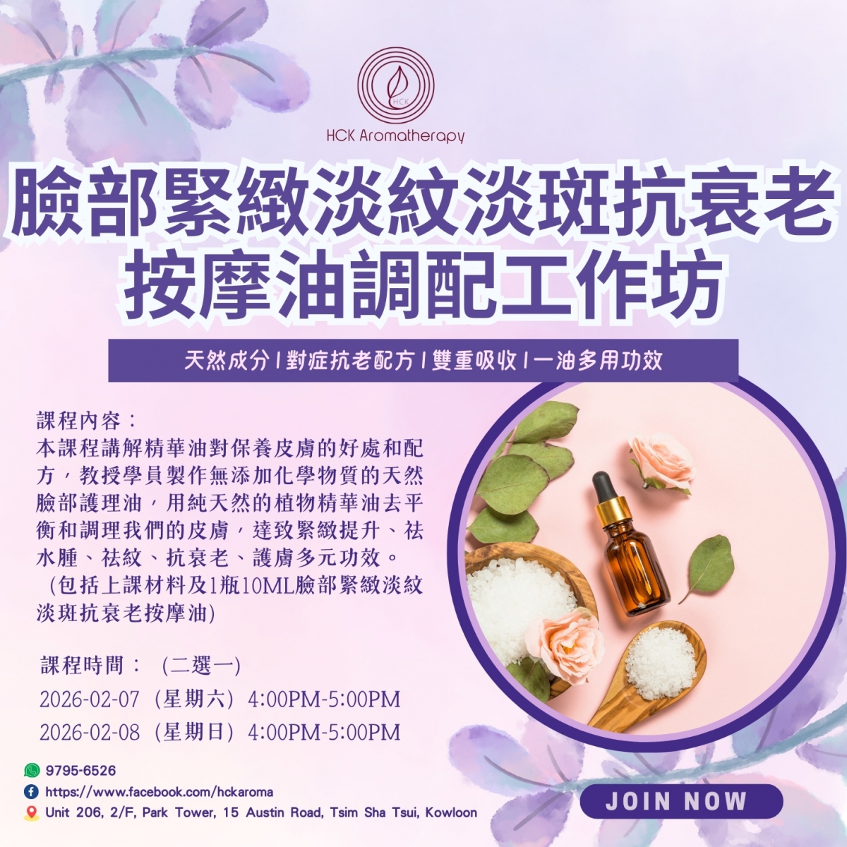 本課程講解精華油對保養皮膚的好處和配方,教授學員製作無添加化學物質的天然臉部護理油,用純天然的植物精華油去平衡和調理我們的皮膚,達致緊緻提升、祛水腫、祛紋、抗衰老、護膚多元功效。 (包括上課材料及1瓶10ml臉部緊緻淡紋淡斑抗衰老按摩油調配工作坊)