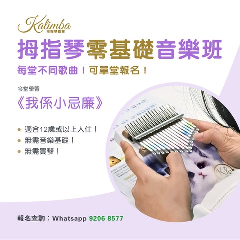 工作坊簡介: .適合12歲或以上人仕,無需音樂基礎! .音樂盒般的旋律! .兩隻手指(左右拇指)就能彈奏! .容易上手,適合都市人學習! .訓練左右腦與身體協調! .教材深入淺出! .上堂由導師借出樂器,無需預先買琴!