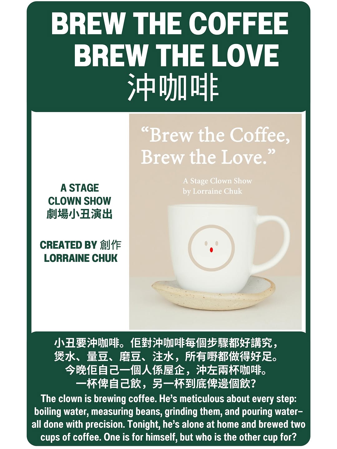 小丑要沖咖啡。佢對沖咖啡每個步驟都好講究,煲水、量豆、磨豆、注水,所有嘢都做得好足。今晚佢自己一個人係屋企,沖左兩杯咖啡。一杯俾自己飲,另一杯到底俾邊個飲?