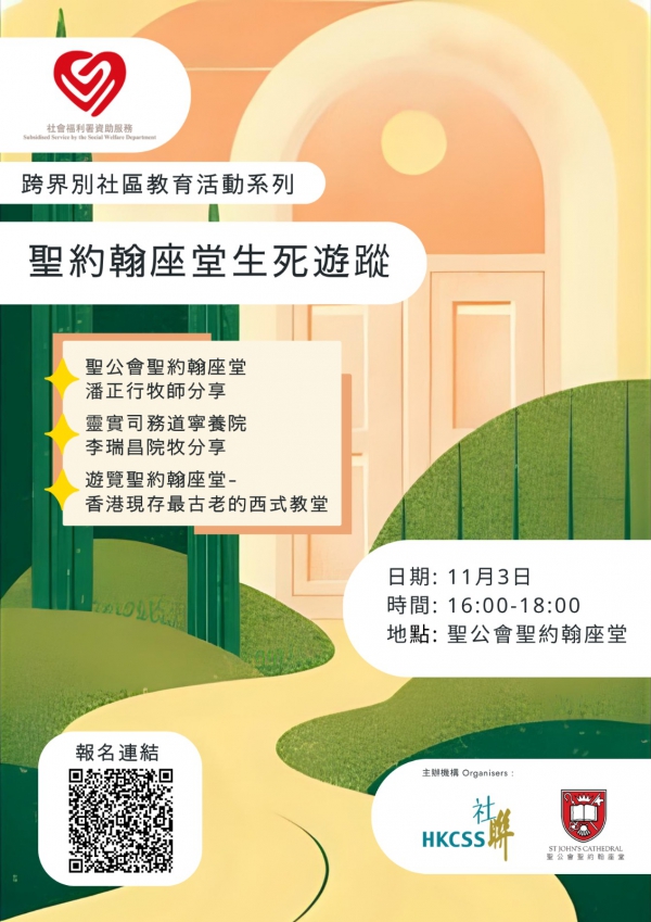 聖約翰座堂潘正行牧師將以其豐富的牧職經驗,分享在香港聖公會聖約翰座堂主持安息禮的點滴與思考。透過為臨終病人傅油、和家屬商討安息禮細節等等事宜,將深入探討牧師如何從基督宗教及信仰的視角看待生命的終結。靈實司務道寧養院同工李瑞昌院牧亦會從前線經驗分享基督教機構的安寧服務。分享環節後,參加者將遊覽這座香港現存最古老的西式教堂,了解聖約翰座堂在香港歷史上扮演的重要角色,見證了這座城市數百年來的社會變遷,以及一代又一代市民的生老病死。