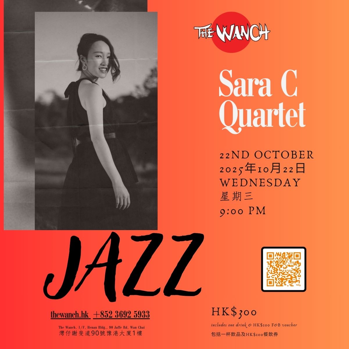 Sara C. 爵士四重奏將會係The Wanch 帶比大家爵士樂嘅魅力同中國經典音樂嘅優美! 10 月 22 日晚上 9 點到10 點 15 分,Sara C. 爵士四重奏會用佢深情迷人嘅爵士聲音同埋動感十足嘅編曲,將深受喜愛嘅粵語同普通話金曲以爵士樂同波薩風格重新演繹——非常適合啲尋求新鮮刺激嘅Jazz Fans!