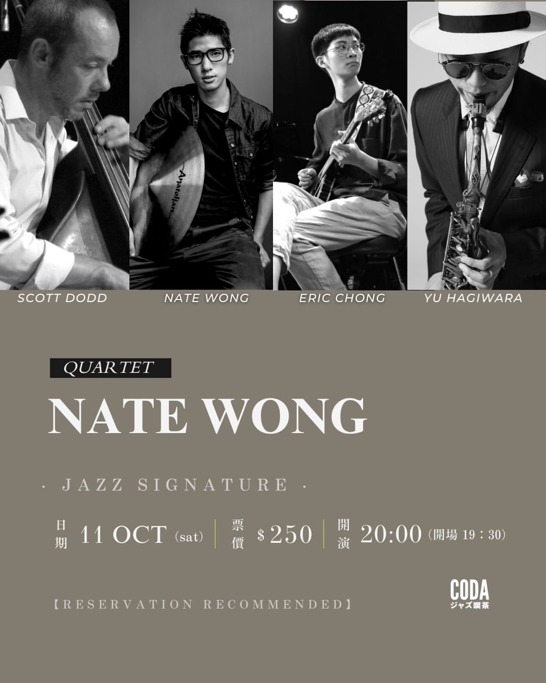 當鼓手兼樂團領軍人Nate Wong率領四重奏登台CODA Jazz Kissa,觀眾將體驗的不只是一場演出——更是當代爵士最真實的集體創作樣貌。雖以他為名,這個四人組合實則展現了平等對話的藝術精神:薩克斯手Yu Hagiwara、吉他手Eric Chong、低音大提琴手Scott Dodd,每位皆是獨當一面的音樂家,共同鑄就現代爵士的協作本質。