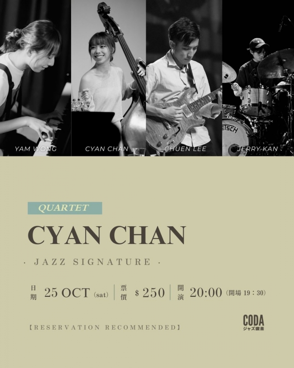 香港樂壇罕見既能執起低音大提琴沉吟,又能以人聲飄然吟唱的爵士女聲Cyan Chan,將率新晉四重奏重返CODA Jazz Kissa。本次陣容包括吉他手Chuen Lee、鍵盤手Yam Wong及鼓手Jerry Kan,既是一場朋友間私密的音樂旅程,更是一場以音樂對時間作感嘆的音樂會。