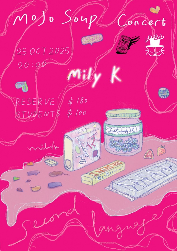 Mily K @milymilyk 兼起曲詞編唱和專輯封面繪畫等創作,Mily K於2022年推出個人首張專輯《R》,2025年更推出了收錄17首歌的二專《Headspace》,希望透過不同媒介,把她各個面向的碎片拼湊起來,梳理自己的思考和感受。這次Mily會聯同結他手Lawrence, 低音結他手Sam, 鼓手Lewa一同演出,給大家多元化的音樂體驗!將難以言狀的心情輕繫於旋律的氣球上,不吐不快的糾結即隨風飄散,或許降落,或許暫借空氣的震動,繼續尋覓。
