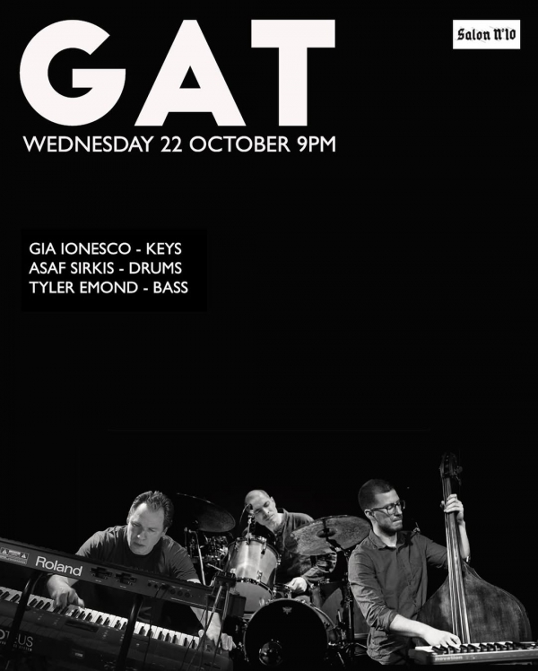 Salon 10 presents GAT, a new jazz rock band formed by veteran musicians Gia Ionesco, Asaf Sirkis and Tyler Emond.