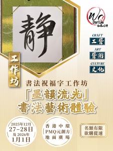 本工作坊的精髓在於讓您親身體驗在被譽為「日本國寶」的越前和紙上進行創作。在米雪老師指導下,學員將於其溫潤獨特的紙面上書寫「感恩」、「和平」、「喜樂」及「希望」等寓意深遠的字詞。越前和紙卓越的質感能讓您完成一幅彌足珍貴、兼具東洋紙韻與中華筆墨的藝術傑作,裝裱後即成傳家擺設。同時,參加者可以優惠價現場購買米雪老師親筆簽名著作《點心紙 - 「一盅兩件」點心寫畫帖》及《悅寫》。
