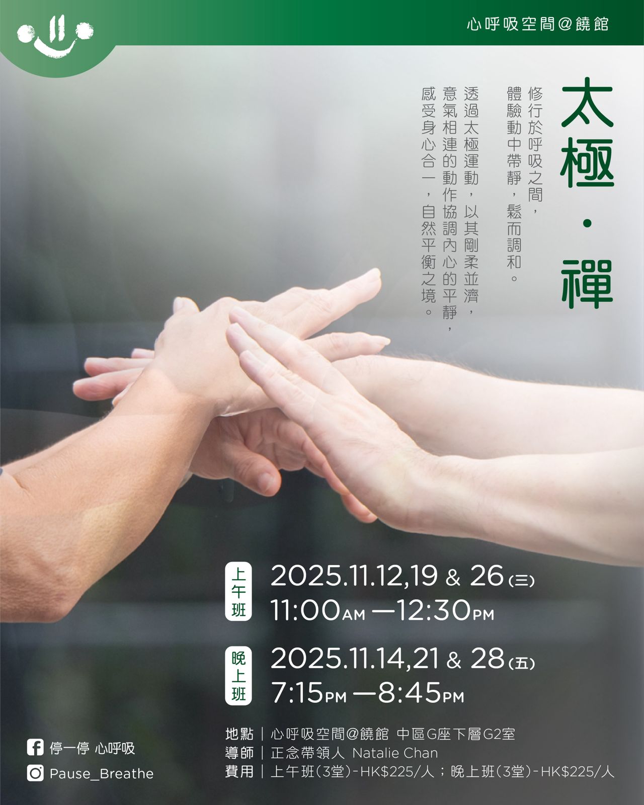 修行於呼吸之間,體驗動中帶靜,鬆而調和。透過太極運動,以其剛柔並濟,意氣相連的動作協調內心的平靜,感受身心合一,自然平衡之境。