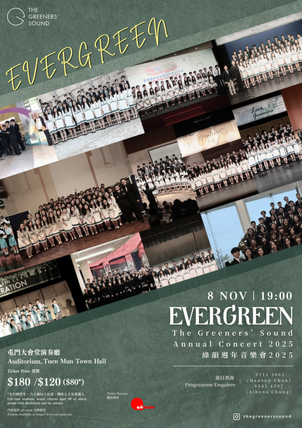 「旋律如常青之林,歲月流轉仍青翠盎然。」踏入15週年的里程碑,今年的週年音樂會以 Evergreen 為主題,綠韻會為大家呈獻學生時期及歷年周年音樂會的多首經典曲目,以歌聲串連過去與現在,與大家一同漫步時光長廊。讓我們以和聲,喚回青春的悸動,共譜一場流轉不息的常青樂章。為大家送上 ———綠韻週年音樂會2025