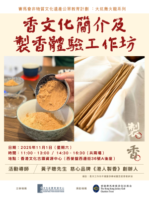 香文化一直與本地的信仰、節慶緊密相連。是次工作坊,我們邀請「港人製香」創辦人介紹香文化與大坑舞火龍這項非物質文化遺產。從聞香到親手體驗古法線香製作,讓指尖的觸感與鼻尖的芬芳,感受傳統工藝的細節,了解火龍與香及香文化的內涵。