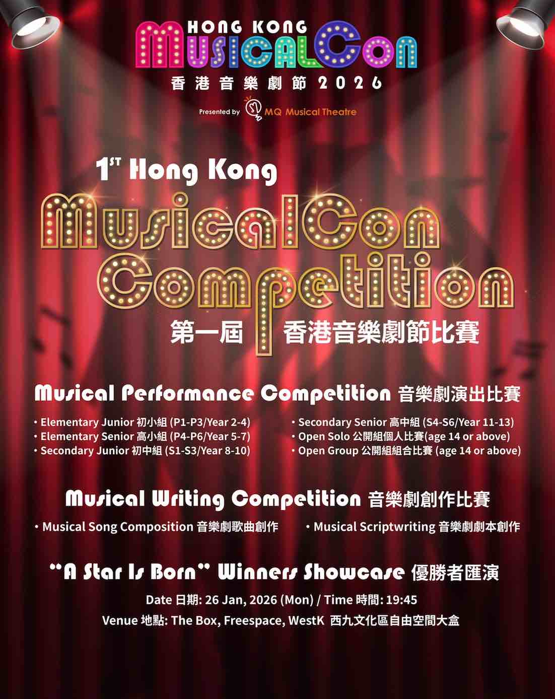 榮譽呈獻首屆《香港音樂劇節比賽》—— 一個致力於發掘與培育新一代音樂劇人才的創新平台。本次頂尖賽事的優勝者將獲得難能可貴的機會,於西九文化區自由空間的大盒參與特別策劃的匯演。這不僅是一場比賽,更是新銳藝術家踏進專業舞台的跳板:他們將於聚光燈下展示作品與才能,與觀眾及業界領袖交流,共同見證創意、熱忱與中英語音樂劇的創造力、熱情與蓬勃未來。