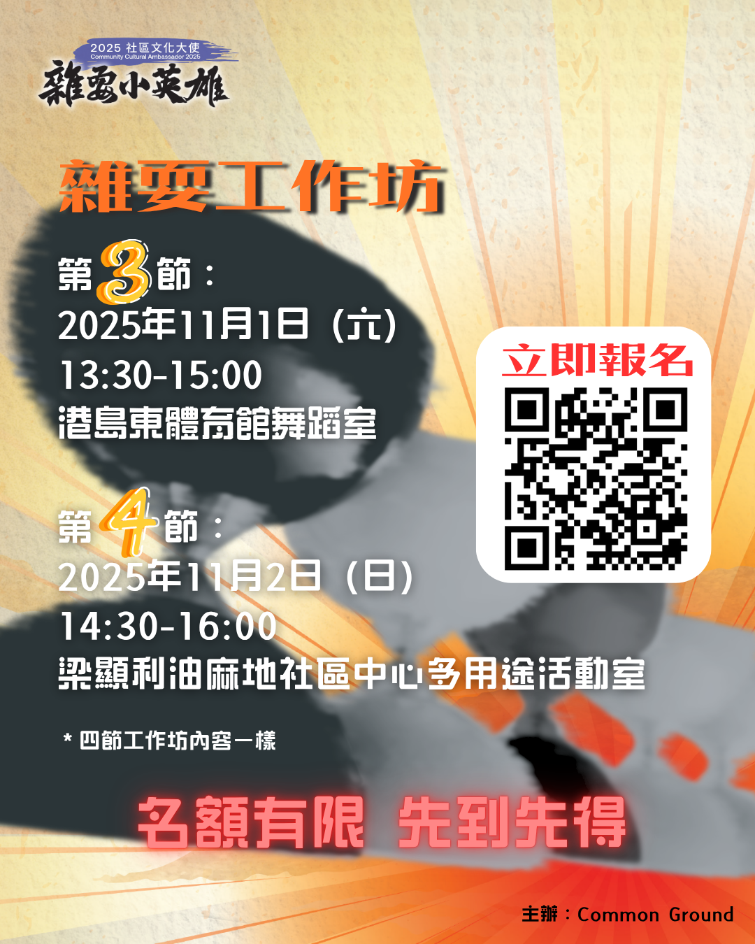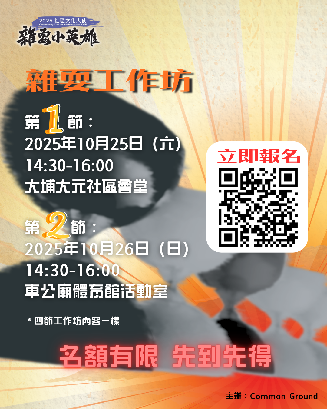 ・每位參加者只可參與一節工作坊。你可於報名時選擇多於一個時段,主辦單位將會通知你最終安排