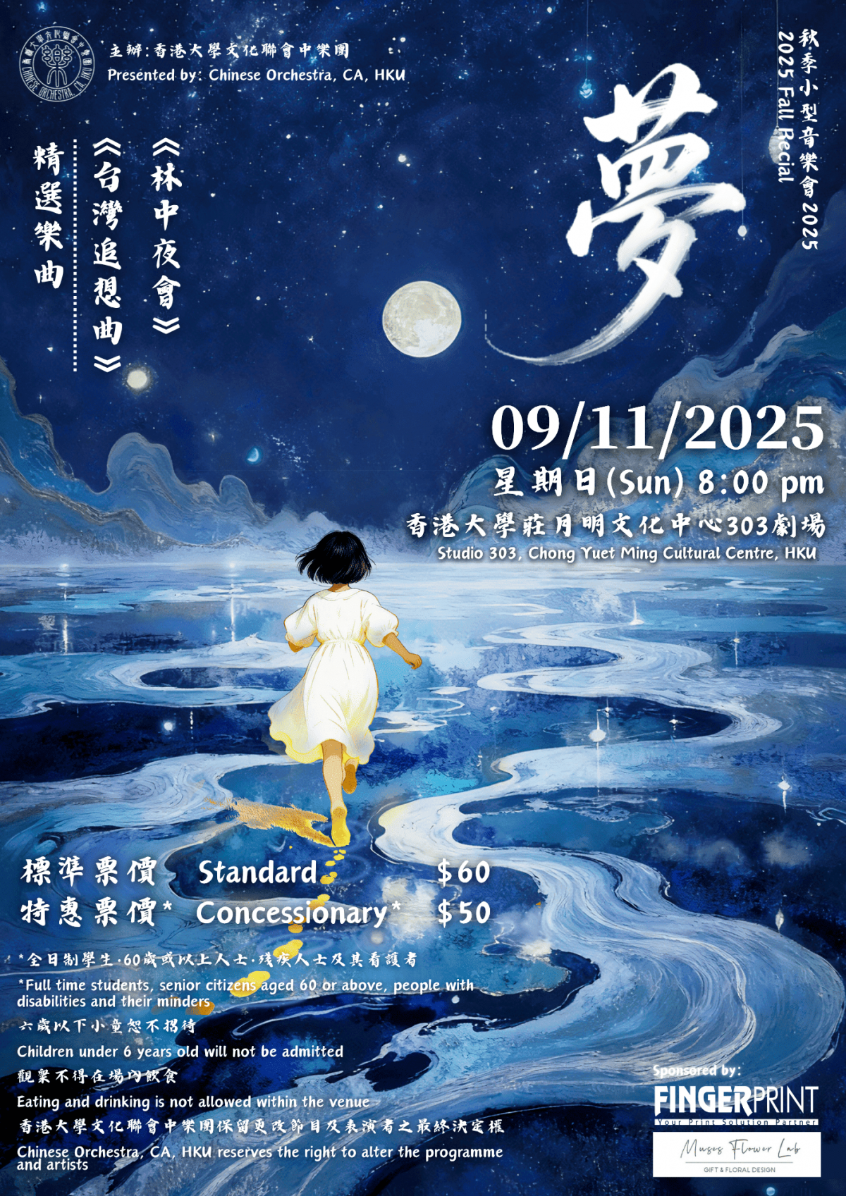 這個十一月,誠邀您蒞臨香港大學文化聯會中樂團的秋季小型音樂會《夢》。讓音符化作蝶翼,引領我們穿梭於奇想、懷舊與詩意之間。從《旋蹦跳》二胡弦上躍動的歡快節奏,到《大魚海棠》鋪陳的電影畫卷;從《白牡丹》琴聲中綻放的清雅脫俗,到《台灣追想曲》裡翻湧的情懷——我們將以絲竹管弦,共鳴萬千種夢的頻率。