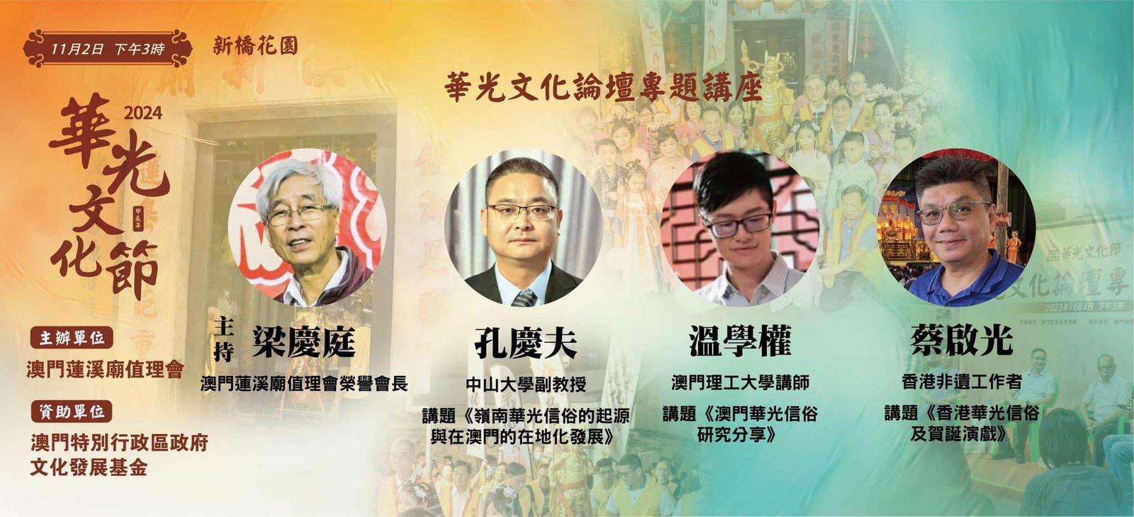 論壇由澳門廟宇節慶文化促進會創會會長梁慶庭主持,邀請了粵港澳三地嘉賓分享,中山大學副教授孔慶夫主講《嶺南華光信俗的起源與在澳門的在地化發展》、香港非遺工作者蔡啟光主講《香港華光信俗及賀誕演戲》、澳門理工大學講師温學權主講《澳門華光信俗研究》,現場觀眾討論熱烈。