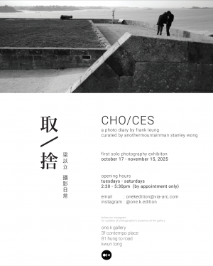 我們之所以感到活着,來自與其他人互動的反射。生命到底是一道單向、命運使然的跑道,還是不斷演變、無窮分岔的山徑,我們每天都走在選擇的路上。時間不等人:這一分鐘的決定,影響下一分鐘的結果。時間亦有限:毎一個小時、每日、每一個旅程、甚至一生人,我們只有有限的機會去決定做什麼。有時候,選擇變成習慣,令我們不以為然,甚至以為沒有選擇,純粹「自然反應」。然而,最自然而持續的選擇,一種恆常的習慣,可以積濾成一幅生命圖騰;每一下按下快門,代表一個選擇,場景、主體、光影、構圖反映一些取捨。橫跨十五年、穿越國界,《取/捨》首次結集八十多張「問題比答案多」的黑白照片,以八個章節,表達對周遭環境、人物的好奇、疑問、同情、恩慰、喜悅⋯⋯,及對活著的一份難以言喻的情感。