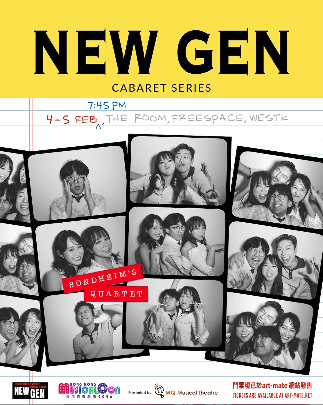 《New Gen: Sondheim's Quartet》是New Gen 最新的音樂會企劃,精選 Sondheim 多部經典音樂劇作品。由四位新一代音樂劇演員 Chloe Wong、Natalie Hung、Marco Tang及 Hank Kwong 演出,以歌聲及現場伴奏,重新演繹這位大師筆下的經典篇章。