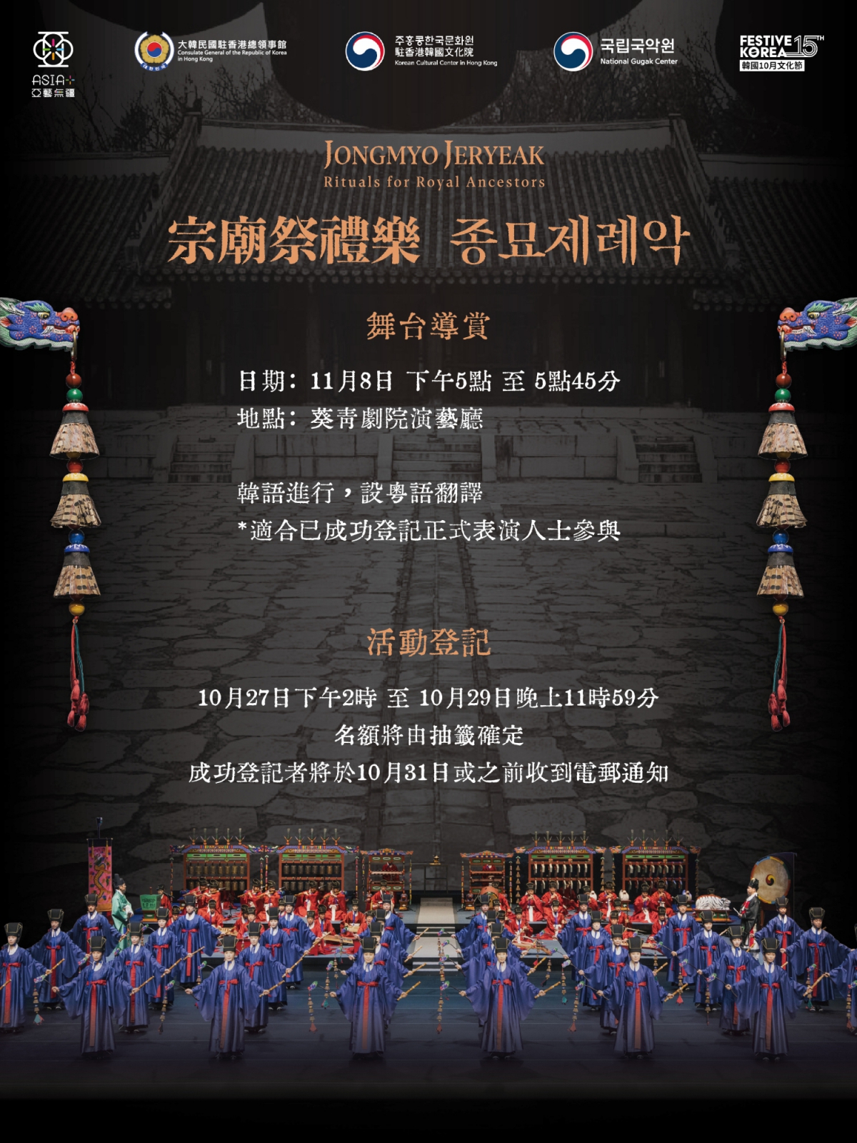 韓國國立國樂院將首次到訪香港,於韓國十月文化節期間呈獻「宗廟祭禮樂」演出。