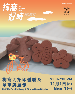 單車是梅窩的一道最自然的風景,也是居民代步的必需品。「梅窩牌坊:梅窩限定單車牌」的團隊使用梅窩的泥土,化成獨特的單車牌,重新想像泥土的可能性,結合這裡最有代表性的元素。來看看梅窩的單車牌,認識每一塊牌背後的獨特故事,並體驗泥土拓印,收集梅窩的圖案及花紋。